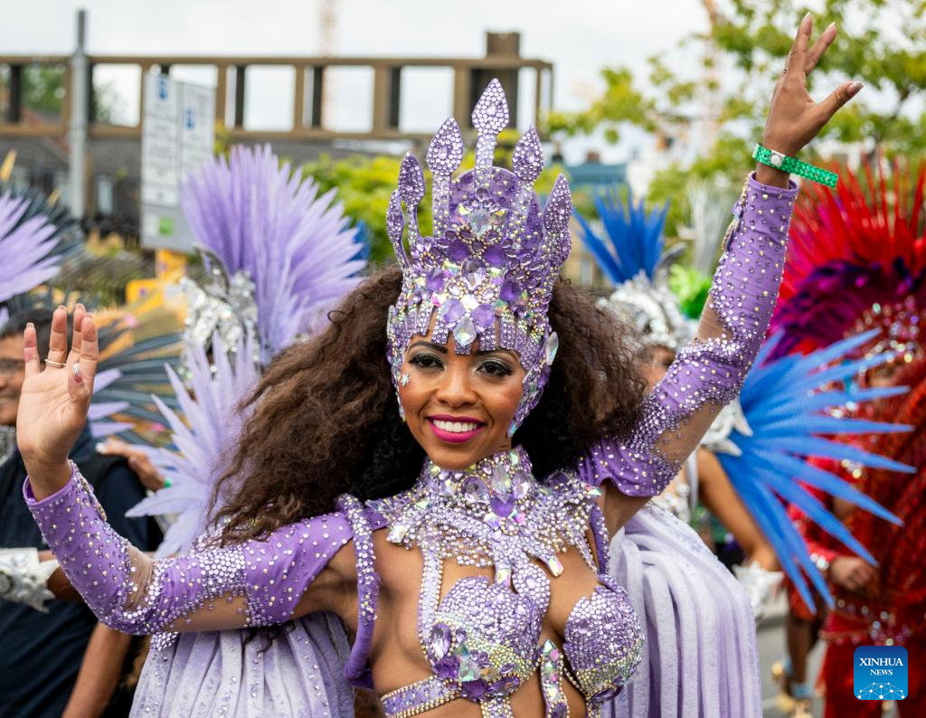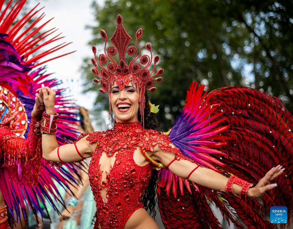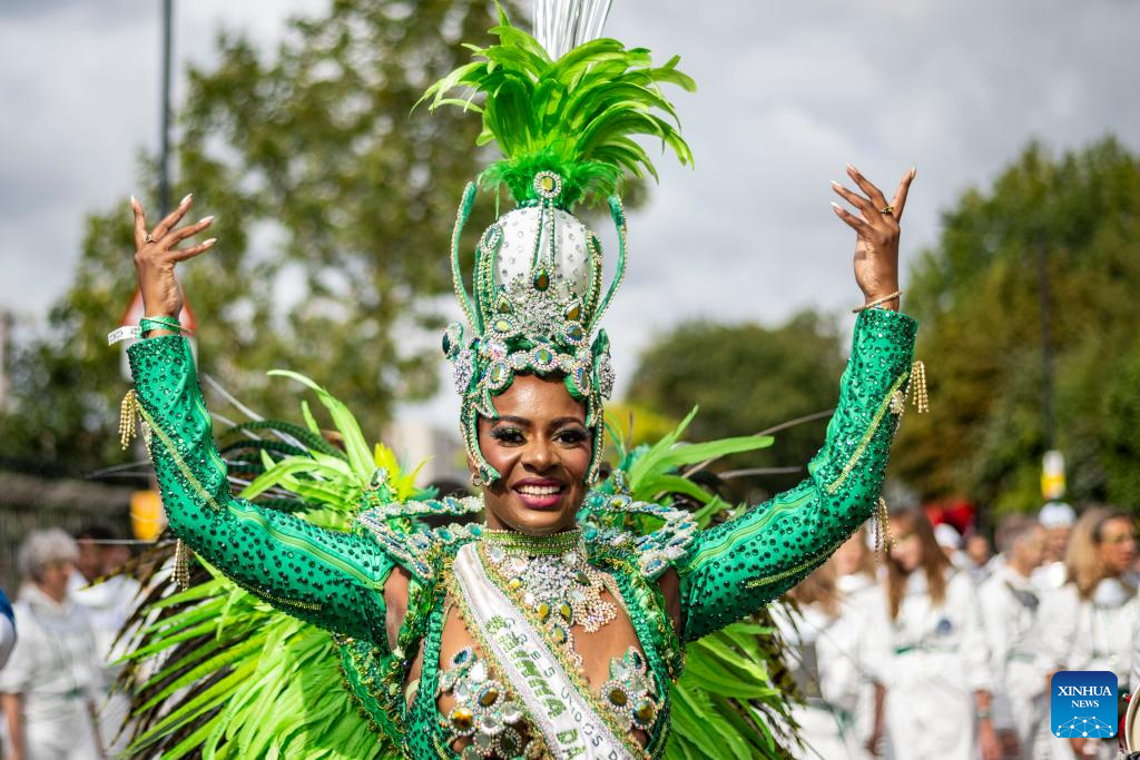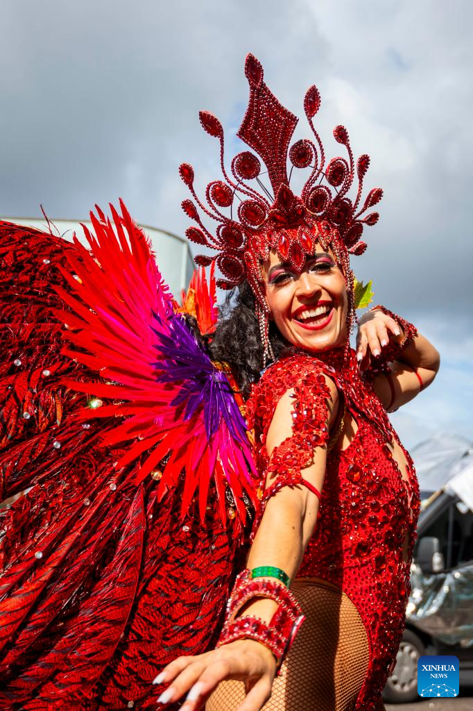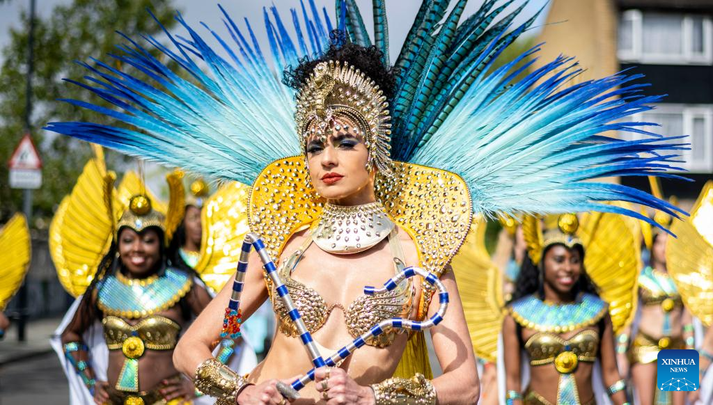 A performer participates in Notting Hill Carnival in London, Britain, on Aug. 28, 2023. Originated in the 1960s, the carnival is a way for Afro-Caribbean communities to celebrate their cultures and traditions. (Photo by Stephen Chung/Xinhua)