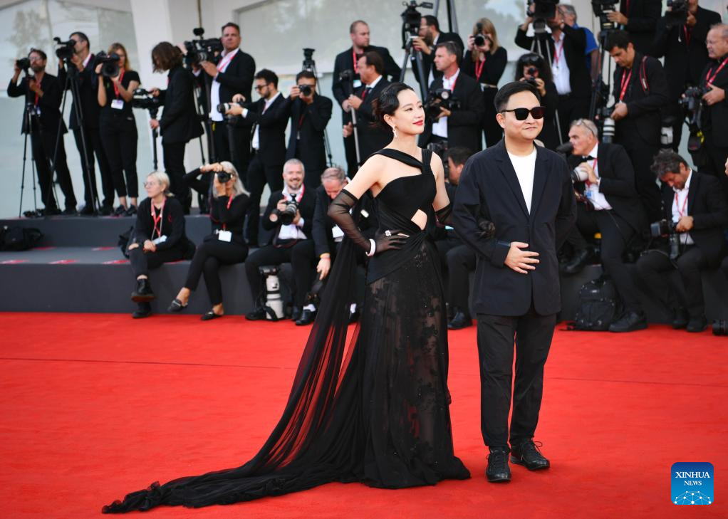 Director Wu Lang (R) and actress Li Meng pose on the red carpet of the 80th Venice International Film Festival in Venice, Italy, Aug. 30, 2023. The 80th annual Venice International Film Festival kicked off here on Wednesday evening, with a diverse line-up of movies competing for the prestigious Golden Lion prize. (Xinhua/Jin Mamengni)