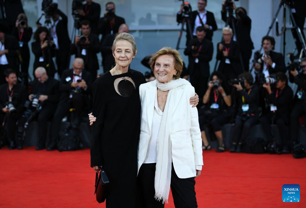 Director Liliana Cavani (R) and actress Charlotte Rampling pose on the red carpet of the 80th Venice International Film Festival in Venice, Italy, Aug. 30, 2023. The 80th annual Venice International Film Festival kicked off here on Wednesday evening, with a diverse line-up of movies competing for the prestigious Golden Lion prize. (Xinhua/Jin Mamengni)