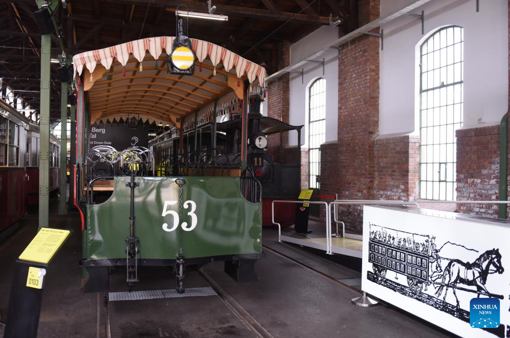 This photo taken on Aug. 30, 2023 shows a horse-drawn tramcar of the 19th century at the Remise, the Transport Museum of Vienna Lines, in Vienna, Austria. The Remise-Transport Museum of Vienna Lines shows historical and modern trams and other vehicles and offers visitors a journey through 150 years of public transport history with Vienna Lines. (Xinhua/He Canling)