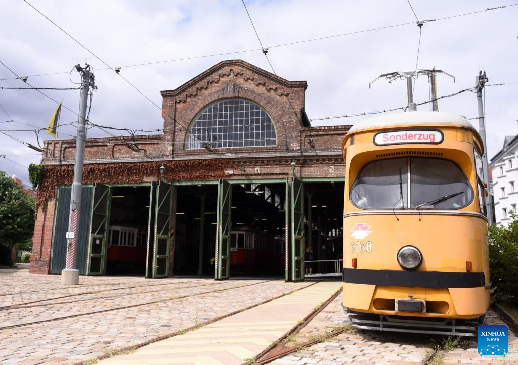 Visitors watch the tramcars at the Remise, the Transport Museum of Vienna Lines, in Vienna, Austria, Aug. 30, 2023. The Remise-Transport Museum of Vienna Lines shows historical and modern trams and other vehicles and offers visitors a journey through 150 years of public transport history with Vienna Lines. (Xinhua/He Canling)