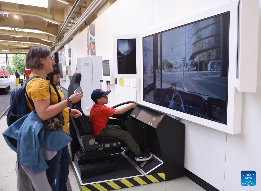 A visitor experiences driving tramcars at the Remise, the Transport Museum of Vienna Lines, in Vienna, Austria, Aug. 30, 2023. The Remise-Transport Museum of Vienna Lines shows historical and modern trams and other vehicles and offers visitors a journey through 150 years of public transport history with Vienna Lines. (Xinhua/He Canling)