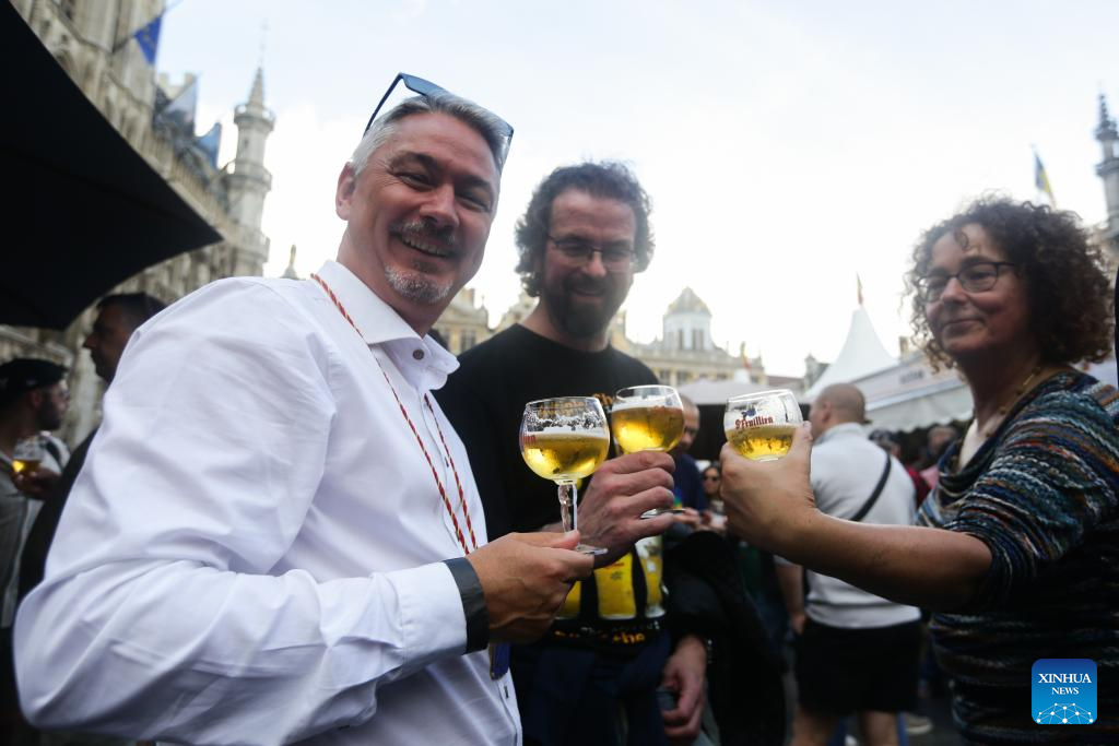 People attend the 23rd Belgian Beer Weekend in Brussels, Belgium, Sept. 2, 2023. More than 500 Belgian beers were presented by 53 breweries to the public during the event. (Xinhua/Zheng Huansong)