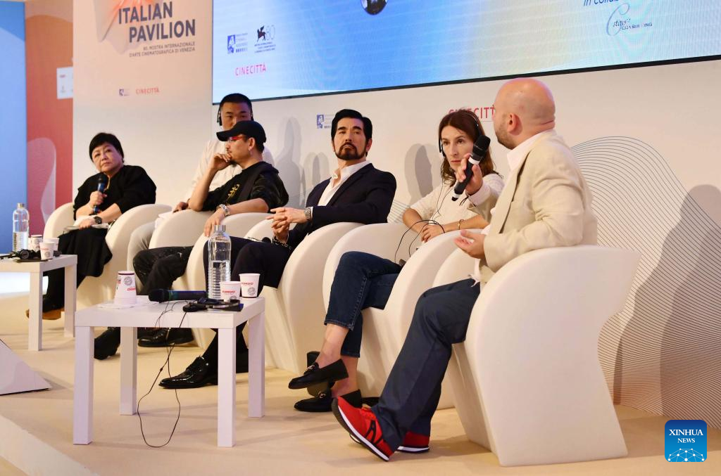 Chinese-American singer and actor Kris Phillips (3rd R) attends a panel discussion themed on "Genre Trends in Global Film Production" during the 80th Venice International Film Festival in Venice, Italy, Sept. 3, 2023. (Xinhua/Jin Mamengni)