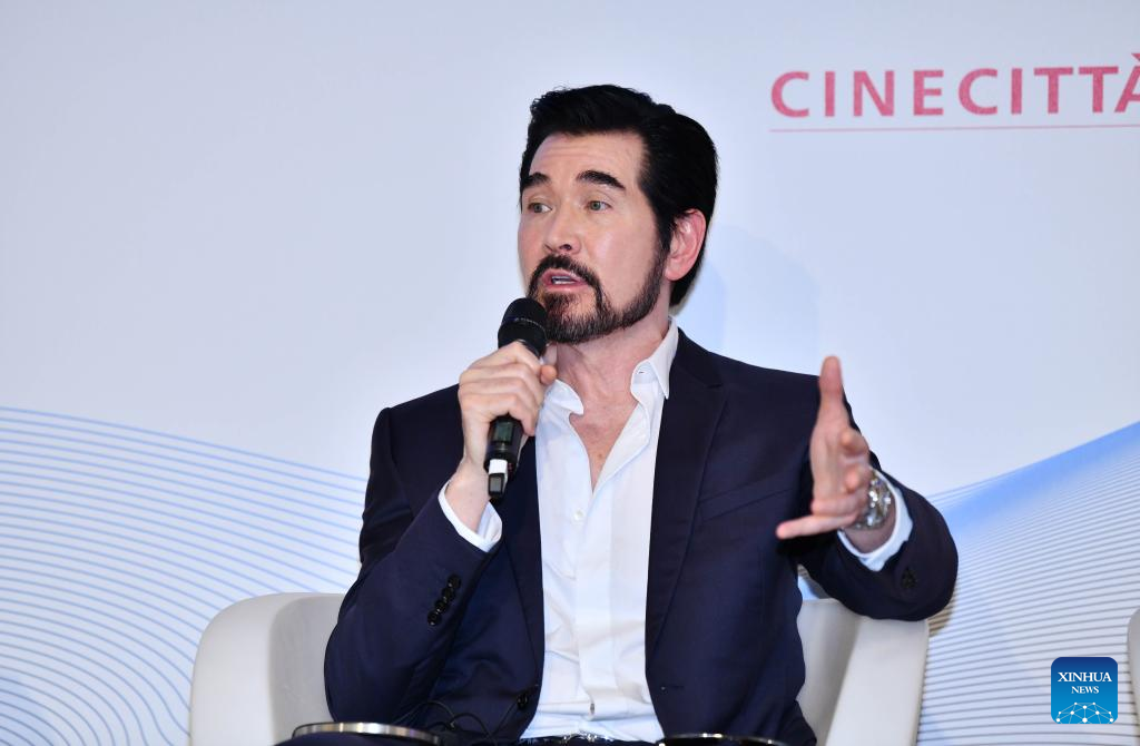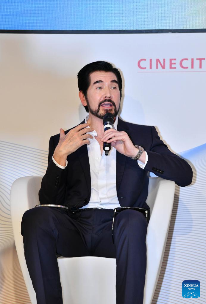 Chinese-American singer and actor Kris Phillips speaks at a panel discussion themed on "Genre Trends in Global Film Production" during the 80th Venice International Film Festival in Venice, Italy, Sept. 3, 2023. (Xinhua/Jin Mamengni)