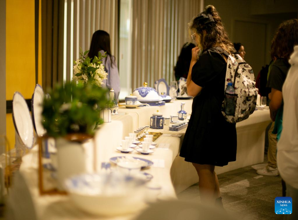 People visit an exhibition of Chinese porcelain products in Sofia, Bulgaria, on Sept. 20, 2023. East China's Jiangxi Province was the subject of a presentation held at the China Cultural Center here on Wednesday. Beyond a general introduction, the event was aimed at encouraging exchanges. (China Cultural Center in Sofia/Handout via Xinhua)