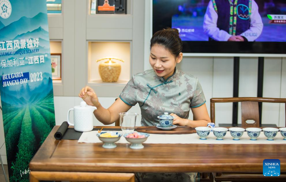 A staff member demonstrates a Chinese tea ceremony in Sofia, Bulgaria, on Sept. 20, 2023. East China's Jiangxi Province was the subject of a presentation held at the China Cultural Center here on Wednesday. Beyond a general introduction, the event was aimed at encouraging exchanges. (China Cultural Center in Sofia/Handout via Xinhua)
