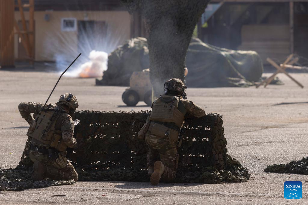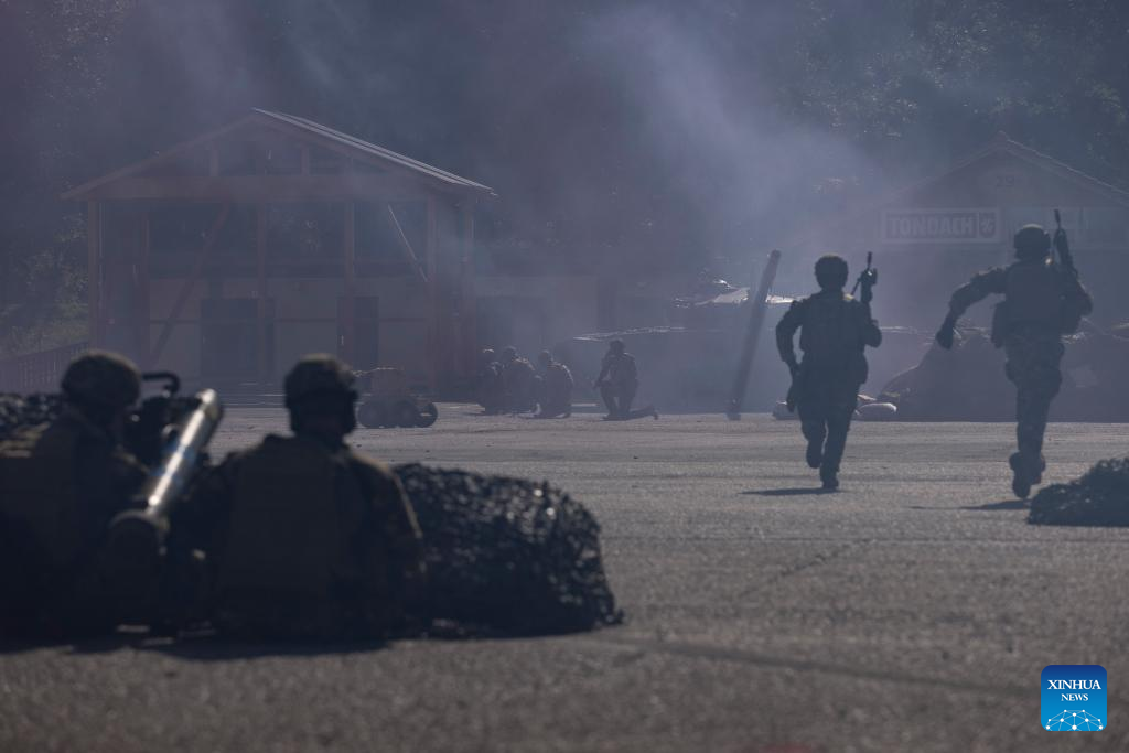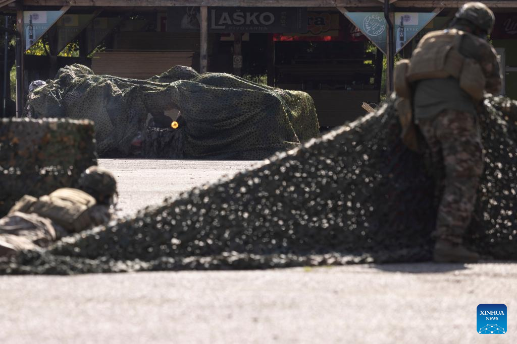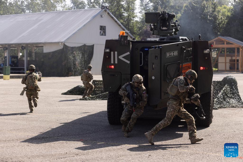 Soldiers demonstrate attacking a fortified position during the SOBRA international fair in Gornja Radgona, Slovenia, on Sept. 21, 2023. Slovenia will increase its defense budget, the country's Minister of Defense Marjan Sarec said at the biennial four-day SOBRA international fair focusing on the areas of defense, security, protection and rescue that opened on Thursday. (Photo by Zeljko Stevanic/Xinhua)