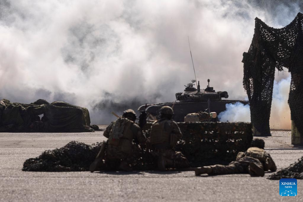 Soldiers demonstrate the destruction of a tank with light anti-tank weapons during the SOBRA international fair in Gornja Radgona, Slovenia, on Sept. 21, 2023. Slovenia will increase its defense budget, the country's Minister of Defense Marjan Sarec said at the biennial four-day SOBRA international fair focusing on the areas of defense, security, protection and rescue that opened on Thursday. (Photo by Zeljko Stevanic/Xinhua)