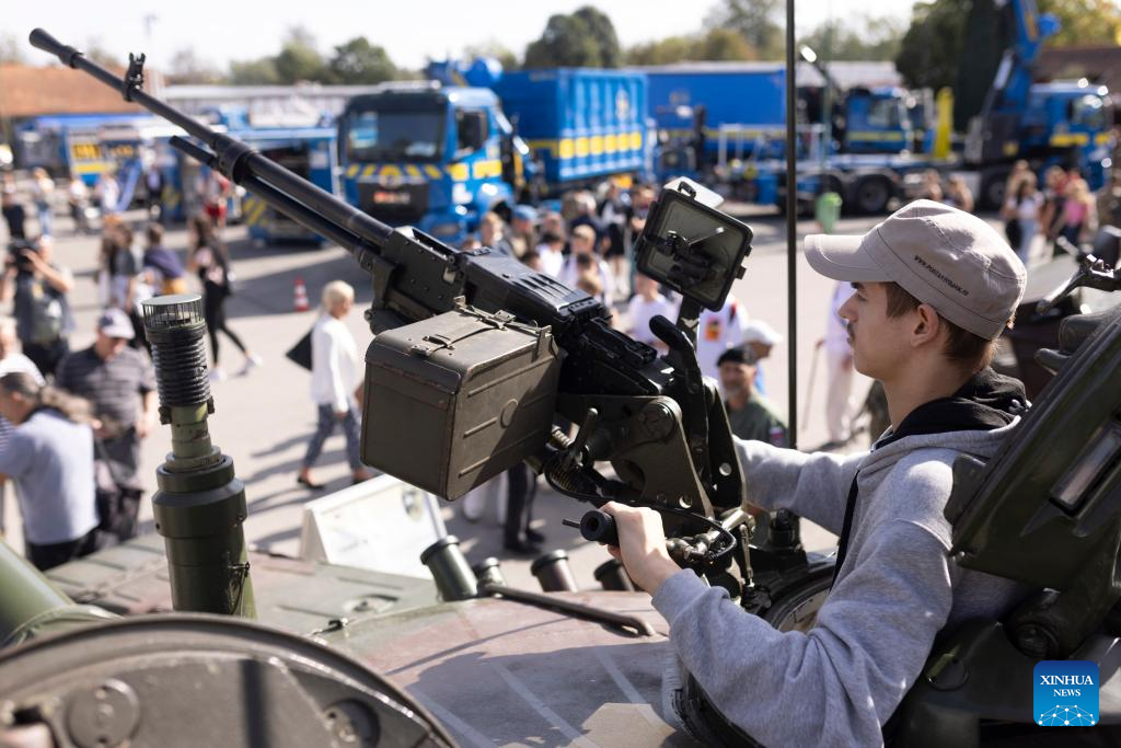 A visitor experiences a Tank M-84 during the SOBRA international fair in Gornja Radgona, Slovenia, on Sept. 21, 2023. Slovenia will increase its defense budget, the country's Minister of Defense Marjan Sarec said at the biennial four-day SOBRA international fair focusing on the areas of defense, security, protection and rescue that opened on Thursday. (Photo by Zeljko Stevanic/Xinhua)