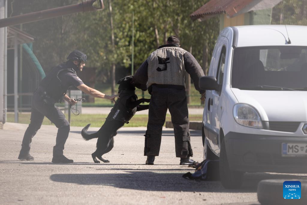 A police dog handler demonstrates his skills during the SOBRA international fair in Gornja Radgona, Slovenia, on Sept. 21, 2023. Slovenia will increase its defense budget, the country's Minister of Defense Marjan Sarec said at the biennial four-day SOBRA international fair focusing on the areas of defense, security, protection and rescue that opened on Thursday. (Photo by Zeljko Stevanic/Xinhua)