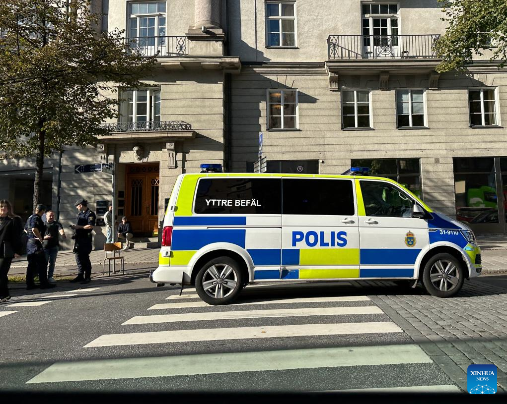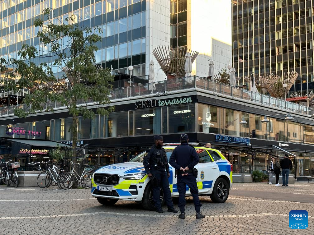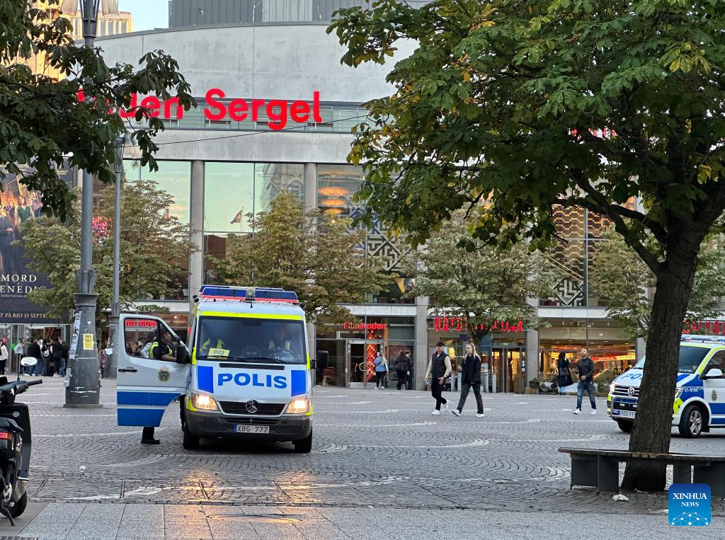 Photo taken on Sept. 21, 2023 shows police patrol in central Stockholm, Sweden. A woman who died in an explosion in Uppsala, west of Stockholm, in the early hours of Thursday became the 12th victim of gang violence fatality in Sweden since the beginning of September, making it the country's deadliest month in four years. (Xinhua/He Miao)