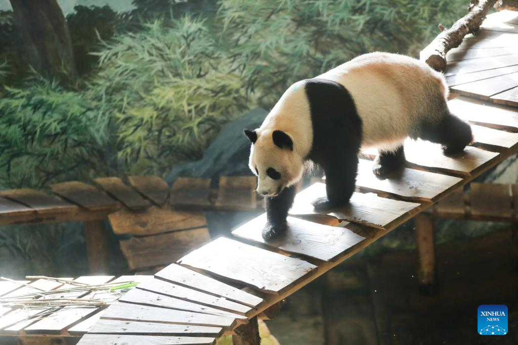 Giant panda Wu Wen walks after her daughter Fan Xing left at the Ouwehands Zoo in Rhenen, the Netherlands, Sept. 27, 2023. More than three years after Fan Xing was born at Ouwehands Zoo in Rhenen, the Netherlands, the giant panda cub received a festive farewell ceremony on Wednesday and left for China. (Xinhua/Zheng Huansong)