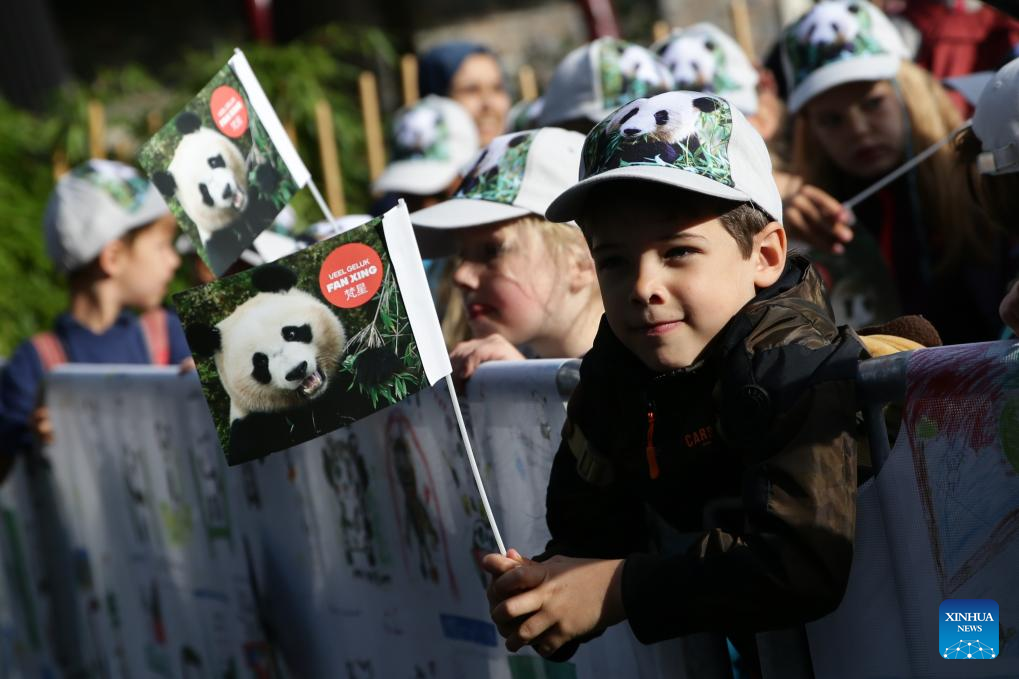 Children attend a farewell ceremony of giant panda Fan Xing at the Ouwehands Zoo in Rhenen, the Netherlands, Sept. 27, 2023. More than three years after Fan Xing was born at Ouwehands Zoo in Rhenen, the Netherlands, the giant panda cub received a festive farewell ceremony on Wednesday and left for China. (Xinhua/Zheng Huansong)