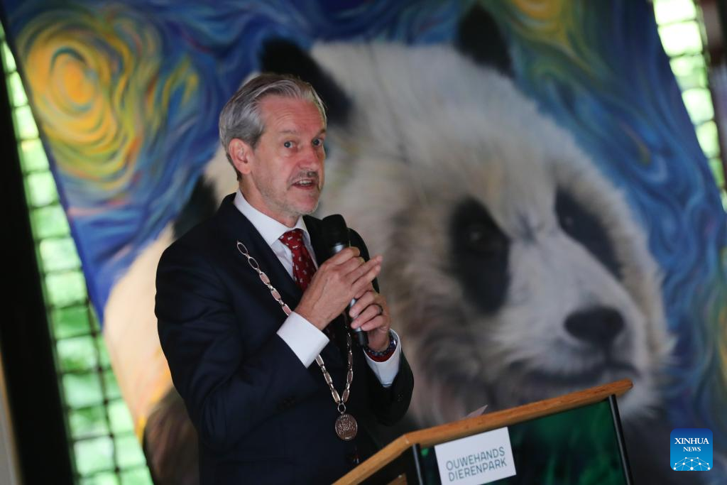 Hans van der Pas, mayor of Rhenen, speaks at a farewell ceremony of giant panda Fan Xing at the Ouwehands Zoo in Rhenen, the Netherlands, Sept. 27, 2023. More than three years after Fan Xing was born at Ouwehands Zoo in Rhenen, the Netherlands, the giant panda cub received a festive farewell ceremony on Wednesday and left for China. (Xinhua/Zheng Huansong)