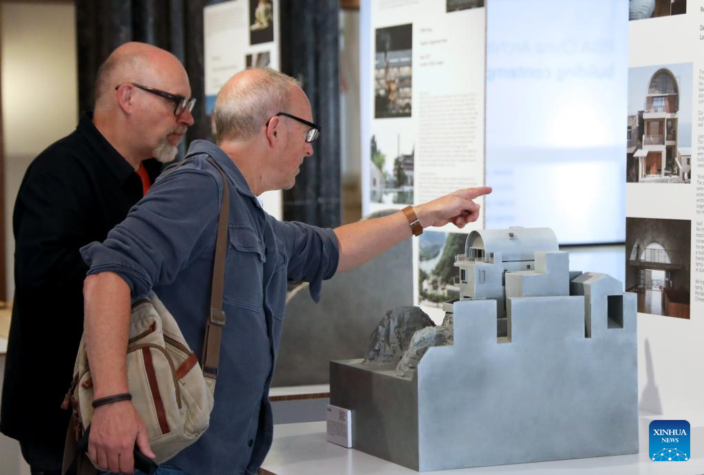 People visit the "Building Contemporary China" architecture exhibition in London, Britain, Sept. 29, 2023. From city museum to rural teahouse, an architecture exhibition showcasing diverse projects designed by Chinese architects kicked off here on Friday. (Xinhua/Li Ying)