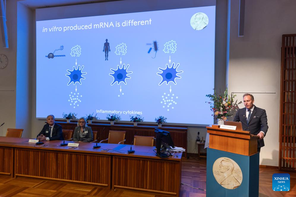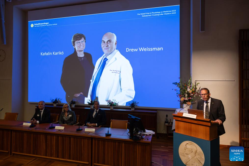The announcement of the 2023 Nobel Prize in Physiology or Medicine is held at the Karolinska Institute in Stockholm, Sweden, on Oct. 2, 2022. Two scientists, Katalin Kariko and Drew Weissman, won the 2023 Nobel Prize in Physiology or Medicine for their discoveries concerning nucleoside base modifications, the Nobel Committee announced on Monday. (Photo by Wei Xuechao/Xinhua)