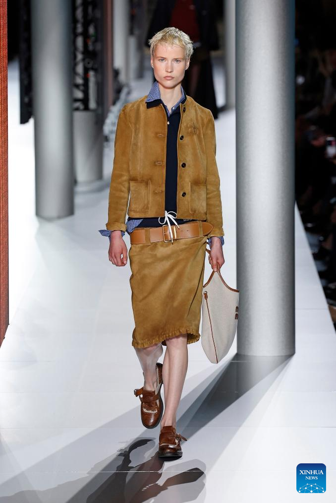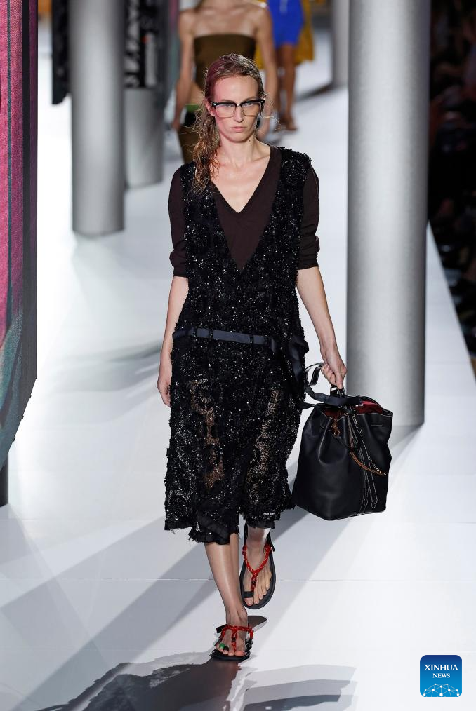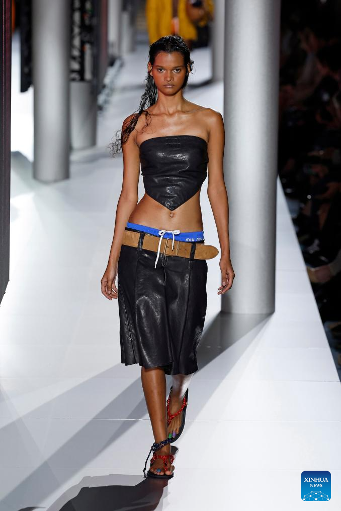 A model presents a creation of Miu Miu's Spring/Summer 2024 ready-to-wear collections during the Paris Fashion Week, in Paris, France, on Oct. 3, 2023. (MeetEurope/Handout via Xinhua)