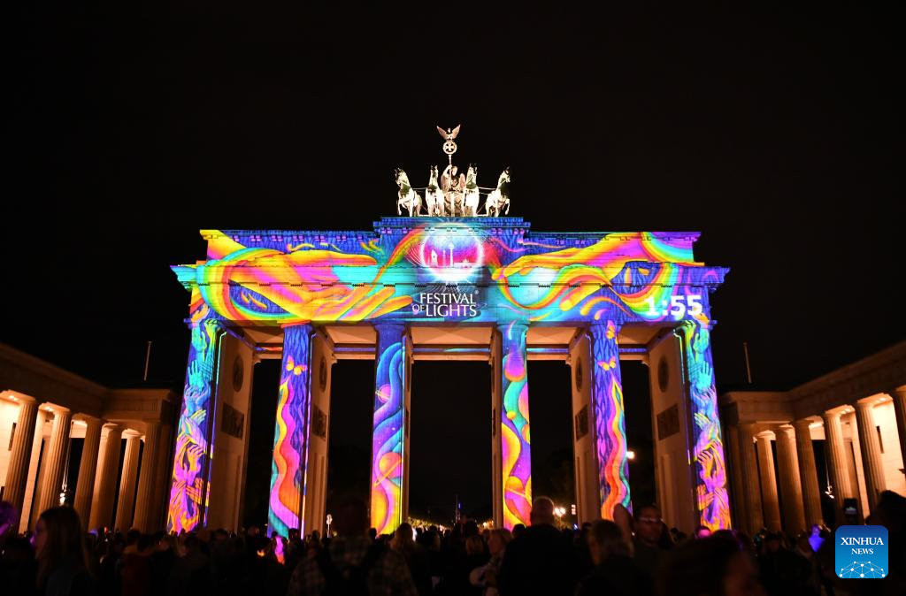 This photo taken on Oct. 6, 2023 shows the illuminated Brandenburg Gate during the 2023 Festival of Lights in Berlin, Germany. Berlin on Friday turned into a city of light art with the opening of the 2023 Festival of Lights, which will last until Oct. 15. (Xinhua/Ren Pengfei)