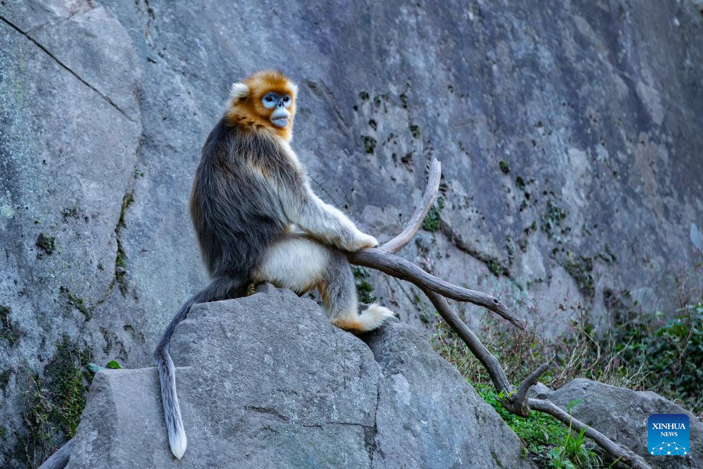 This photo taken on Oct. 14, 2023 shows a Sichuan golden snub-nosed monkey at the Yuhe area of the Giant Panda National Park in northwest China's Gansu Province.