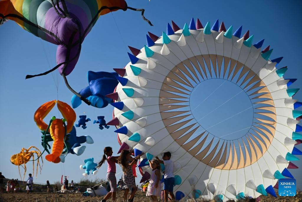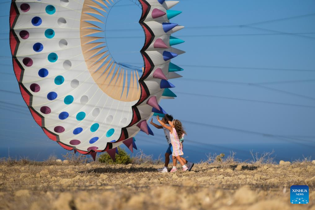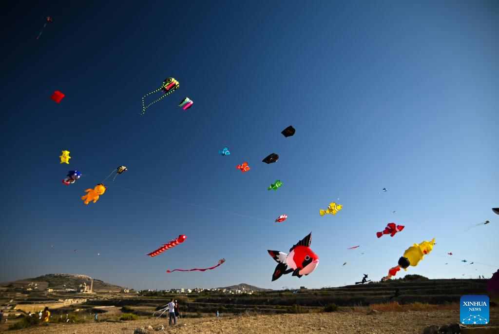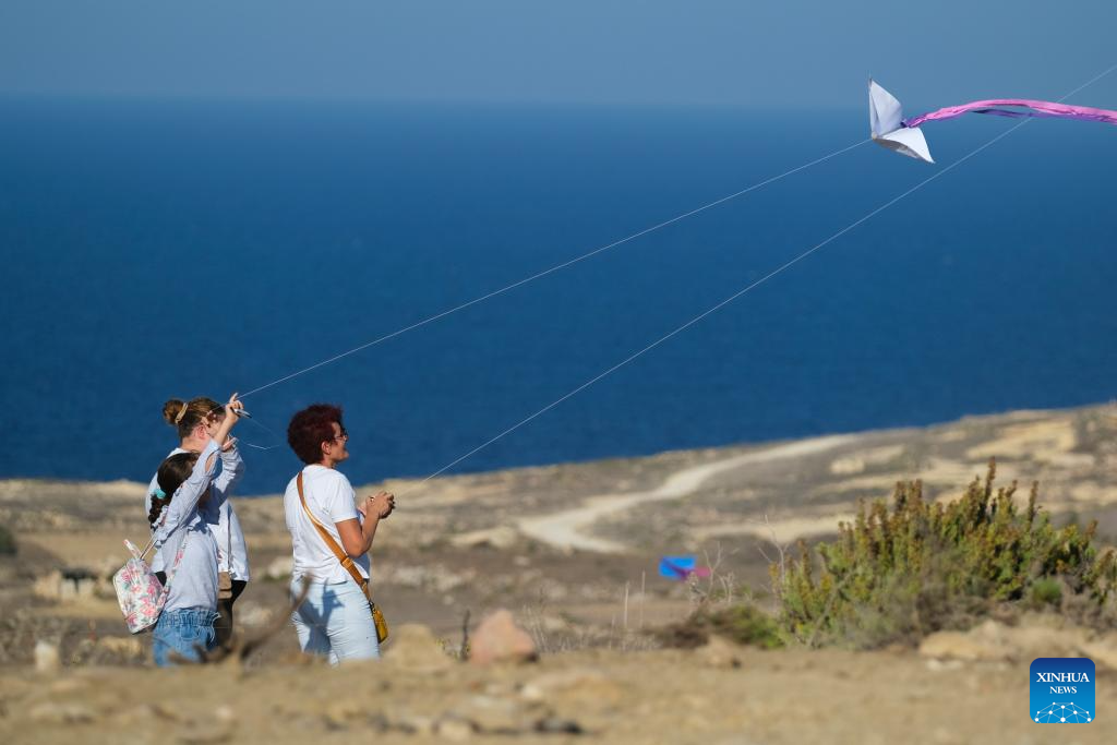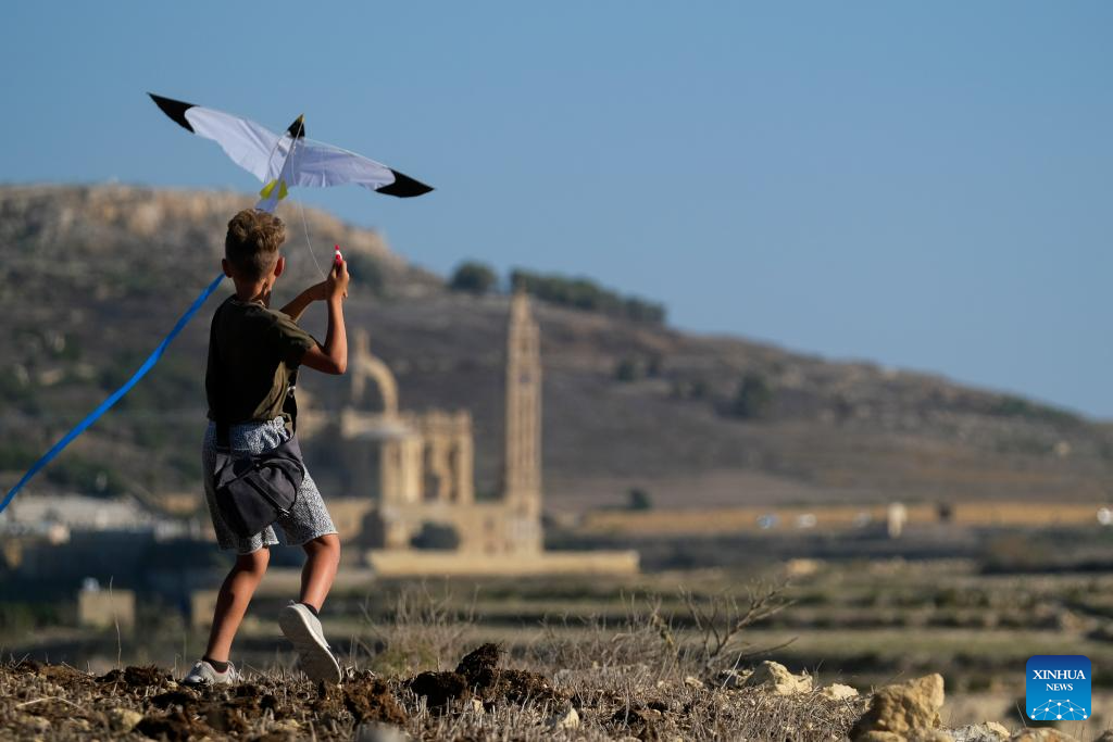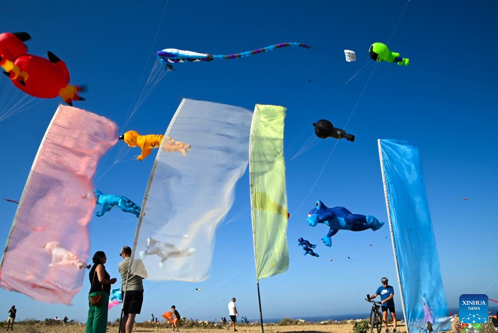 People take part in the 6th edition of the International Kite and Wind Festival in the village of Gharb on the island of Gozo, Malta, on Oct. 15, 2023. (Photo by Jonathan Borg/Xinhua)
