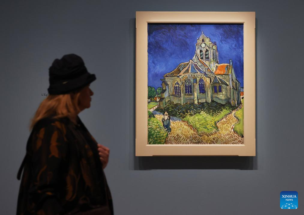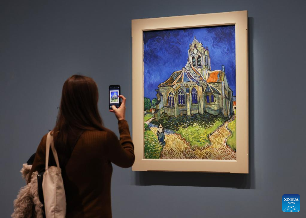 A woman takes photos of "The Church at Auvers" at the exhibition "Van Gogh in Auvers-sur-Oise, the Final Months" at Orsay Museum in Paris, France, Oct. 16, 2023. The exhibition opens for the public from Oct. 3, 2023 to Feb. 4, 2024. (Xinhua/Gao Jing)