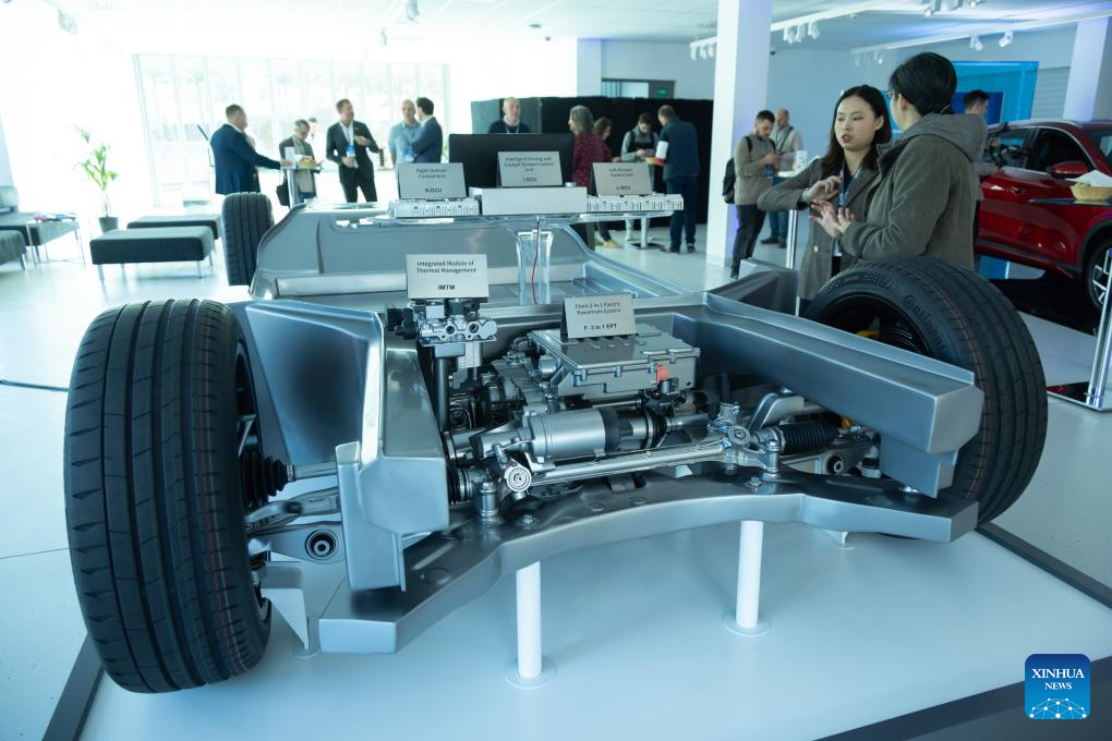 This photo taken on Oct. 17, 2023 shows the chassis system of a BYD electric vehicle in Budapest, Hungary. Chinese electric vehicle manufacturer BYD has taken a leap in its global expansion by launching the sale of its new energy vehicles in Hungary on Tuesday. (Photo by Attila Volgyi/Xinhua)