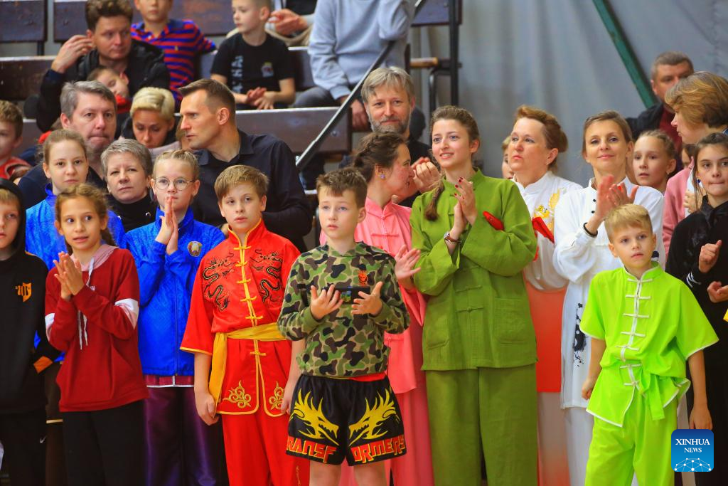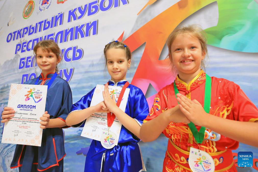 Participants gesture during the awarding ceremony of a Chinese martial arts championship in Minsk, Belarus, on Oct. 21, 2023. (Photo by Henadz Zhinkov/Xinhua)