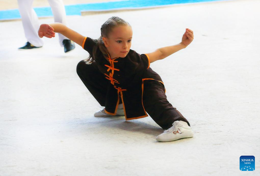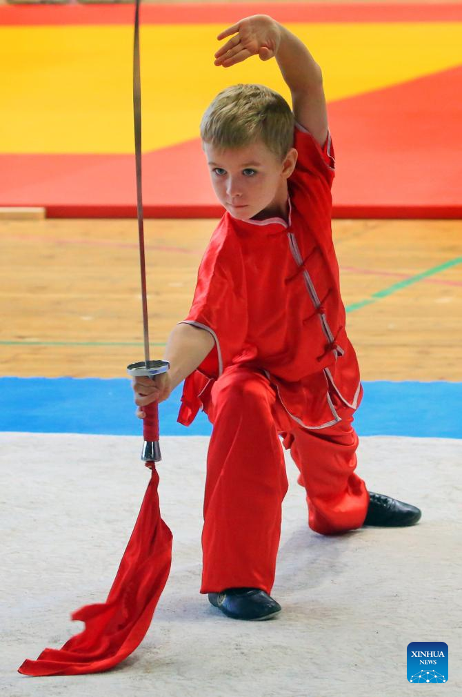 A young participant performs during a Chinese martial arts championship in Minsk, Belarus, on Oct. 21, 2023. (Photo by Henadz Zhinkov/Xinhua)