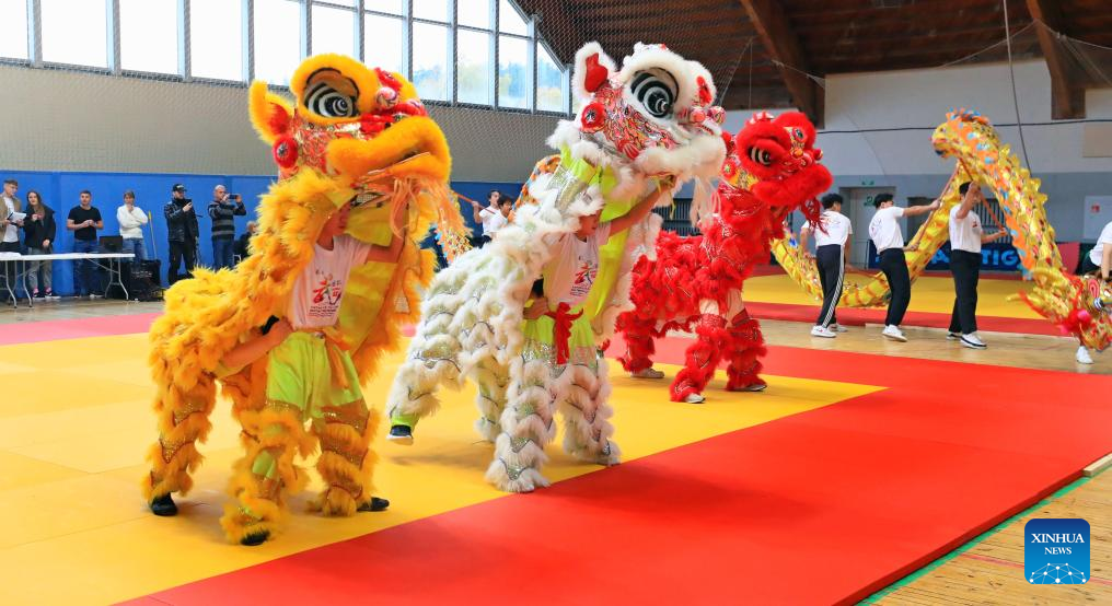 Lion dance performance is staged at a Chinese martial arts championship in Minsk, Belarus, on Oct. 21, 2023. (Photo by Henadz Zhinkov/Xinhua)