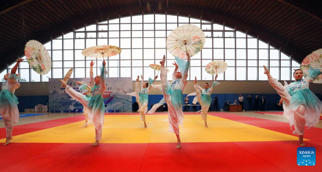 Traditional Chinese dance performance is staged at a Chinese martial arts championship in Minsk, Belarus, on Oct. 21, 2023. (Photo by Henadz Zhinkov/Xinhua)