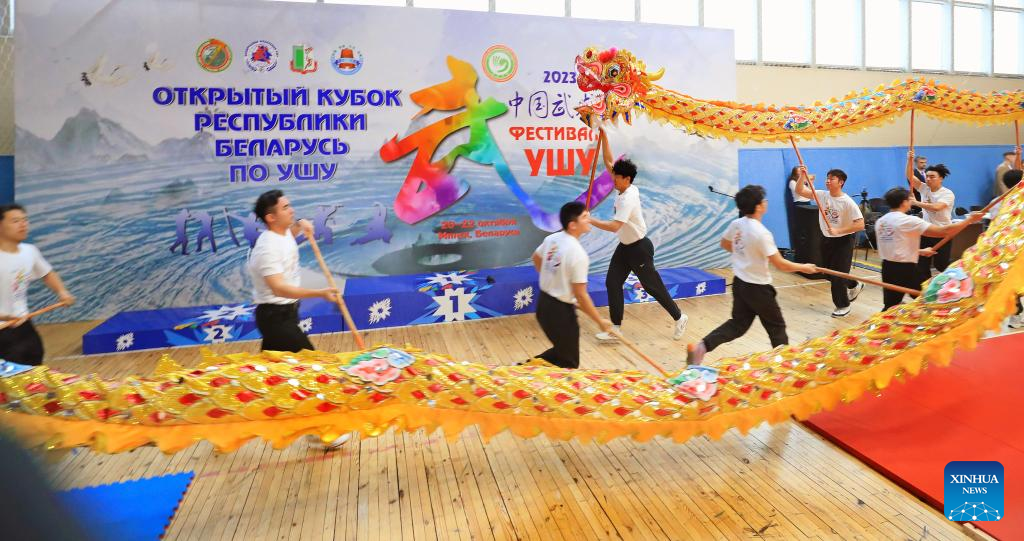 Dragon dance performance is staged at a Chinese martial arts championship in Minsk, Belarus, on Oct. 21, 2023. (Photo by Henadz Zhinkov/Xinhua)