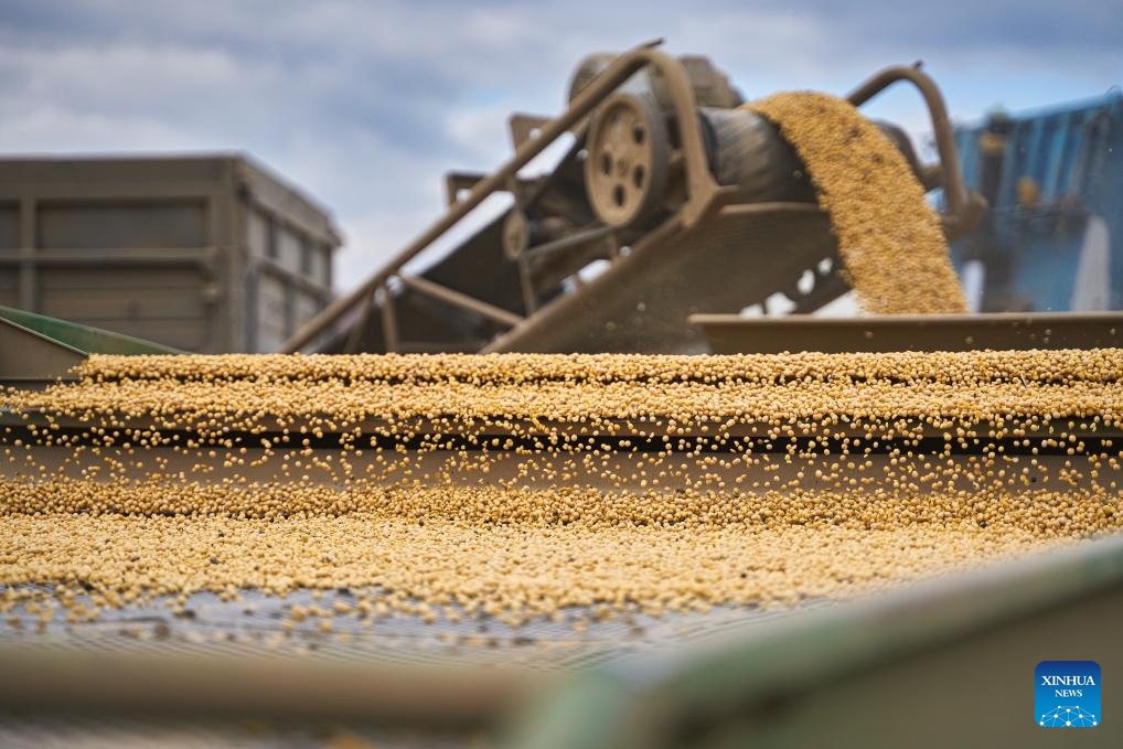 A screening machine processes soybeans in Ussuriysk, Russia, Oct. 22, 2023. The Russian Far East has entered the harvest season, and farms in Ussuriysk are stepping up their efforts to harvest crops such as corn and soybeans. (Photo by Guo Feizhou/Xinhua)