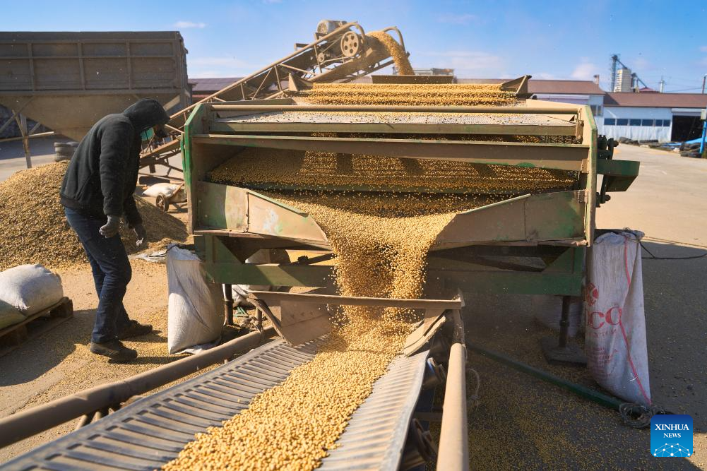 A farmer uses a screening machine to process soybeans in Ussuriysk, Russia, Oct. 22, 2023. The Russian Far East has entered the harvest season, and farms in Ussuriysk are stepping up their efforts to harvest crops such as corn and soybeans. (Photo by Guo Feizhou/Xinhua)