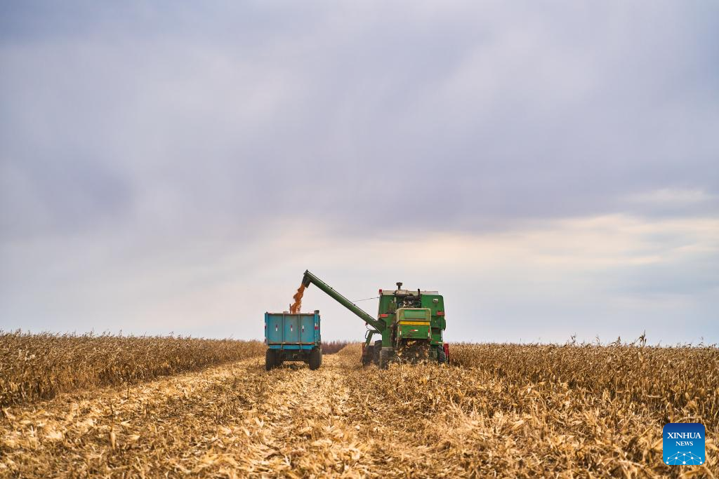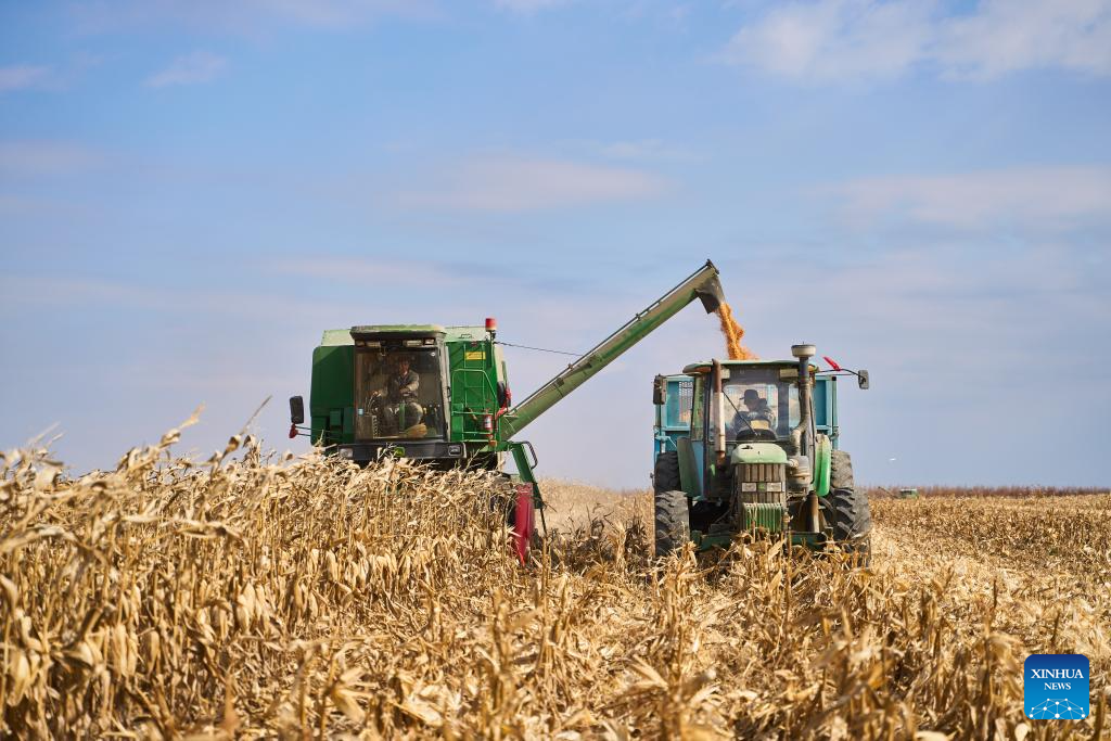 Harvesters work at a field in Ussuriysk, Russia, Oct. 22, 2023. The Russian Far East has entered the harvest season, and farms in Ussuriysk are stepping up their efforts to harvest crops such as corn and soybeans. (Photo by Guo Feizhou/Xinhua)