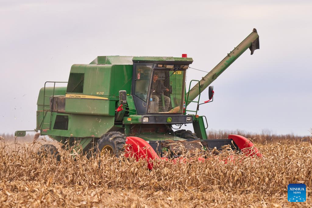 A harvester works at a field in Ussuriysk, Russia, Oct. 22, 2023. The Russian Far East has entered the harvest season, and farms in Ussuriysk are stepping up their efforts to harvest crops such as corn and soybeans. (Photo by Guo Feizhou/Xinhua)