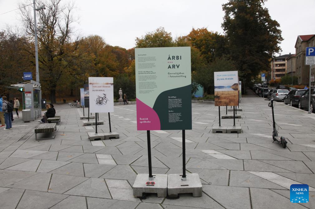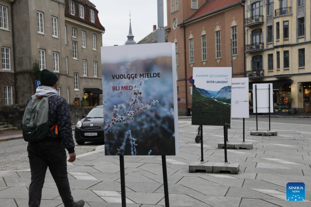 A photo exhibition is held to celebrate Sami Language Week in Oslo, Norway, on Oct. 23, 2023. Norway launched Sami Language Week on Monday, aiming to bring the Sami languages into the public spotlight, increase public knowledge of these indigenous languages and enhance their status. (Photo by Chen Yaqin/Xinhua)