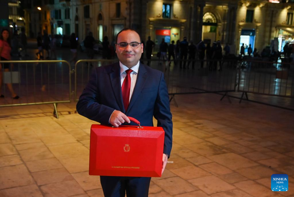 Malta's Finance Minister Clyde Caruana unveils Malta's 2024 budget plan in the parliament in Valletta, Malta on Oct. 30, 2023. Malta's Finance Minister Clyde Caruana pledged on Monday to continue subsidizing the prices of electricity and fuels next year. These subsidies, coupled with the support for cereals, grains and animal feed, will add up to 350 million euros (371 million U.S. dollars). (Photo by Jonathan Borg/Xinhua)