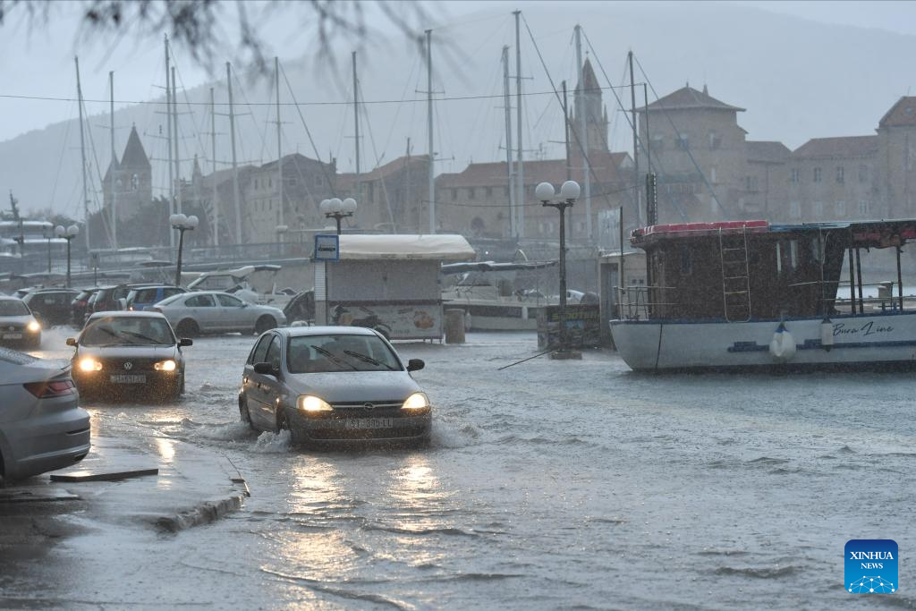 Cars wade through a flooded street after heavy rain in Trogir, Croatia, Nov. 3, 2023. (Josko Herceg/PIXSELL via Xinhua)