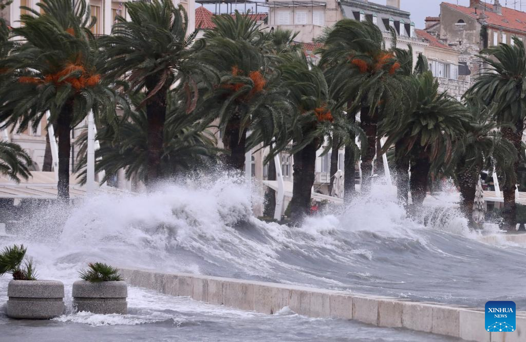 Heavy rain and strong winds cause huge waves in Split, Croatia, Nov. 3, 2023. (Ivo Cagalj/PIXSELL via Xinhua)