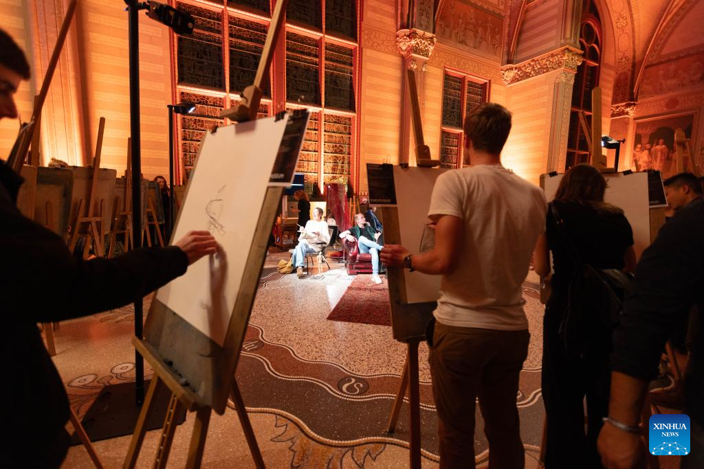 People take part in a figure-drawing workshop at the Rijks museum during the Museum Night event in Amsterdam, the Netherlands, Nov. 4, 2023. The Museum Night is an annual event which allows people to visit Amsterdam's museums at night. (Photo by Sylvia Lederer/Xinhua)