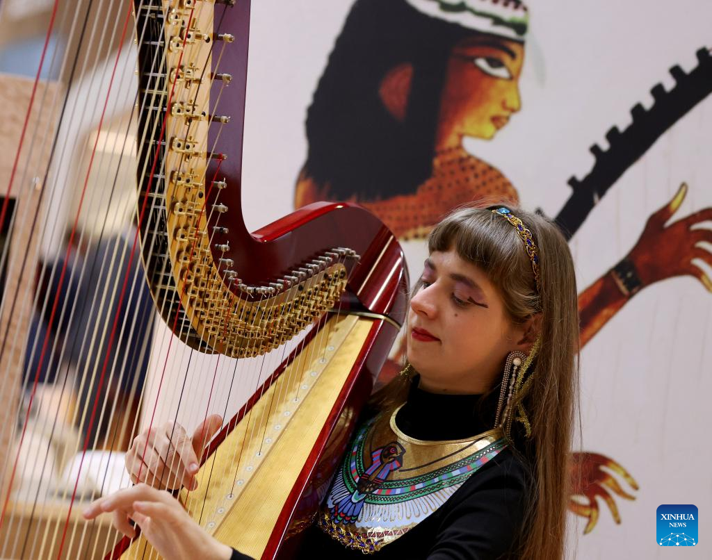 A woman performs at the exhibition booth of Egypt during the World Travel Market (WTM) in London, Britain, Nov. 6, 2023. Launched in 1980, WTM London introduces global travel buyers to the biggest destinations and brands in the world every year. It is one of the world's most influential travel and tourism events.