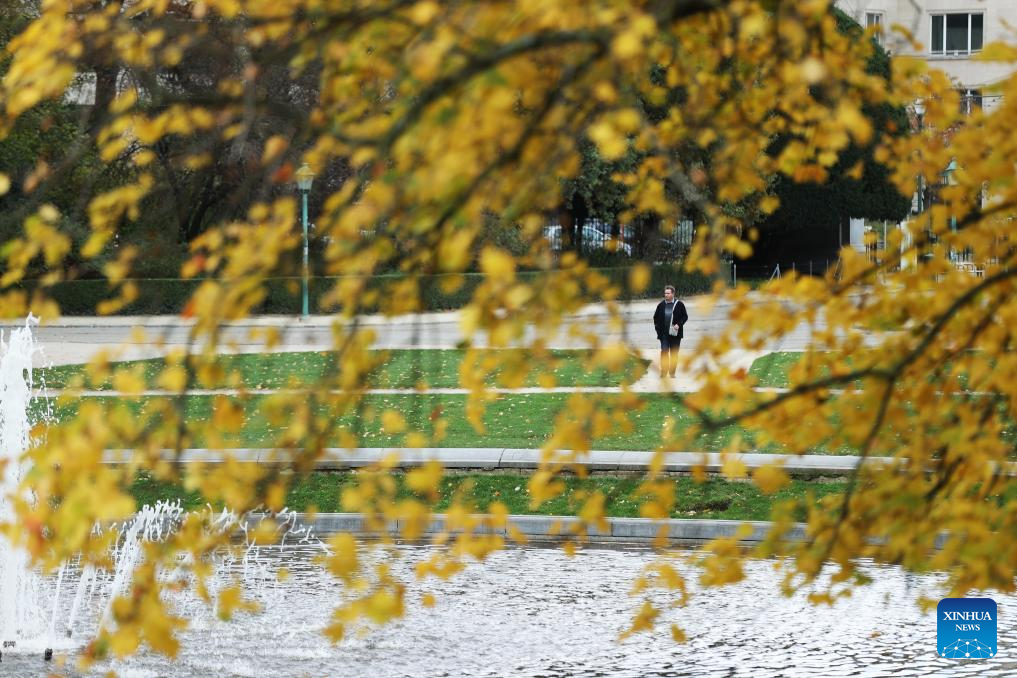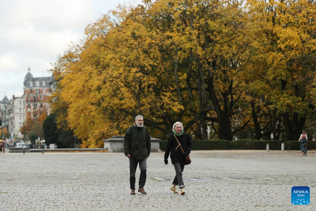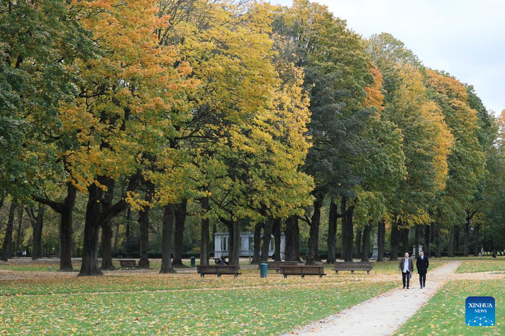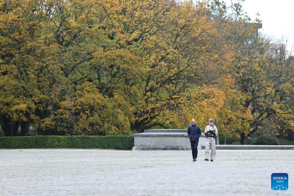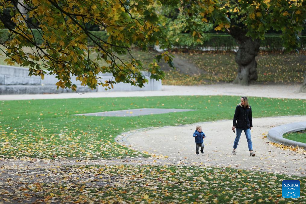 People enjoy the autumn scenery at a park in Brussels, Belgium, Nov. 7, 2023. (Xinhua/Zhao Dingzhe)