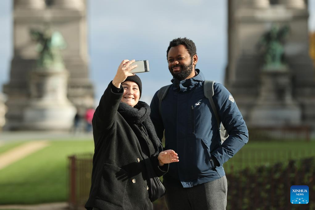 People take selfies at a park in Brussels, Belgium, Nov. 7, 2023. (Xinhua/Zhao Dingzhe)