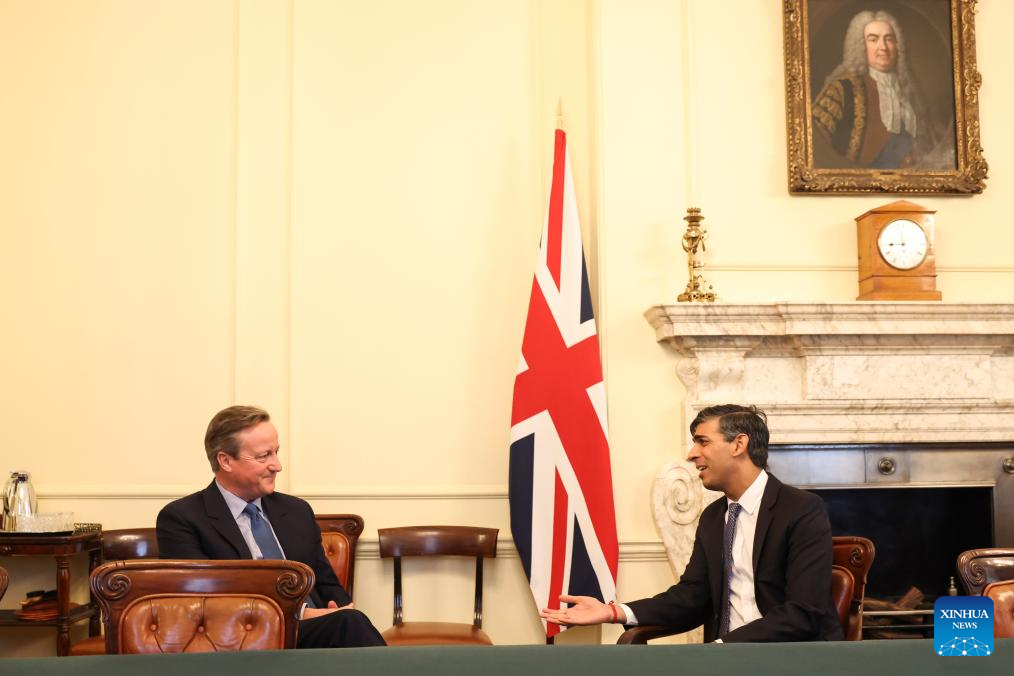 David Cameron (L) speaks with British Prime Minister Rishi Sunak in 10 Downing Street in London, Britain, on Nov. 13, 2023. Former British Prime Minister David Cameron was appointed as Britain's new foreign secretary on Monday amid Prime Minister Rishi Sunak's cabinet reshuffle. (Simon Dawson/No 10 Downing Street/Handout via Xinhua)