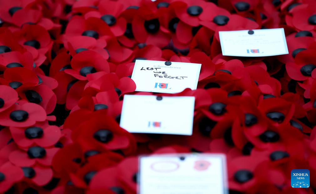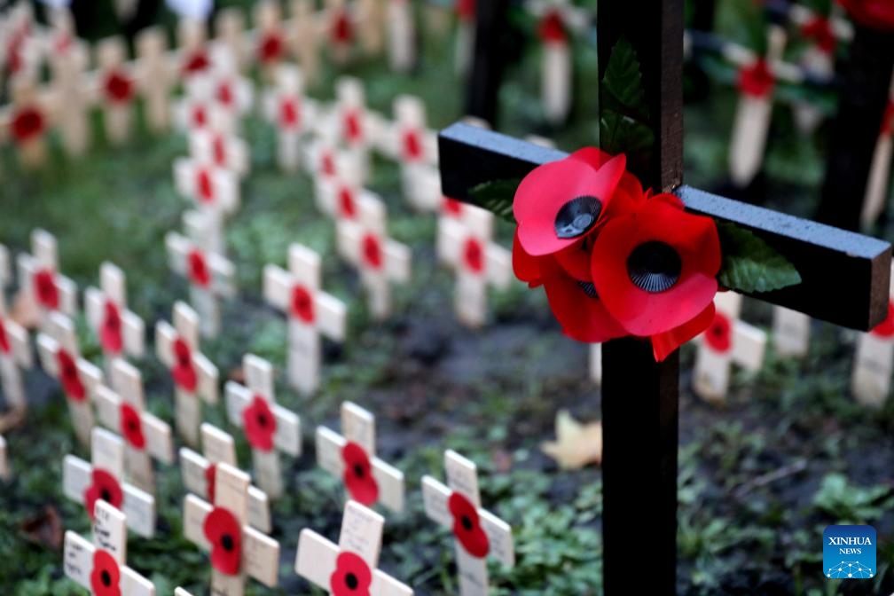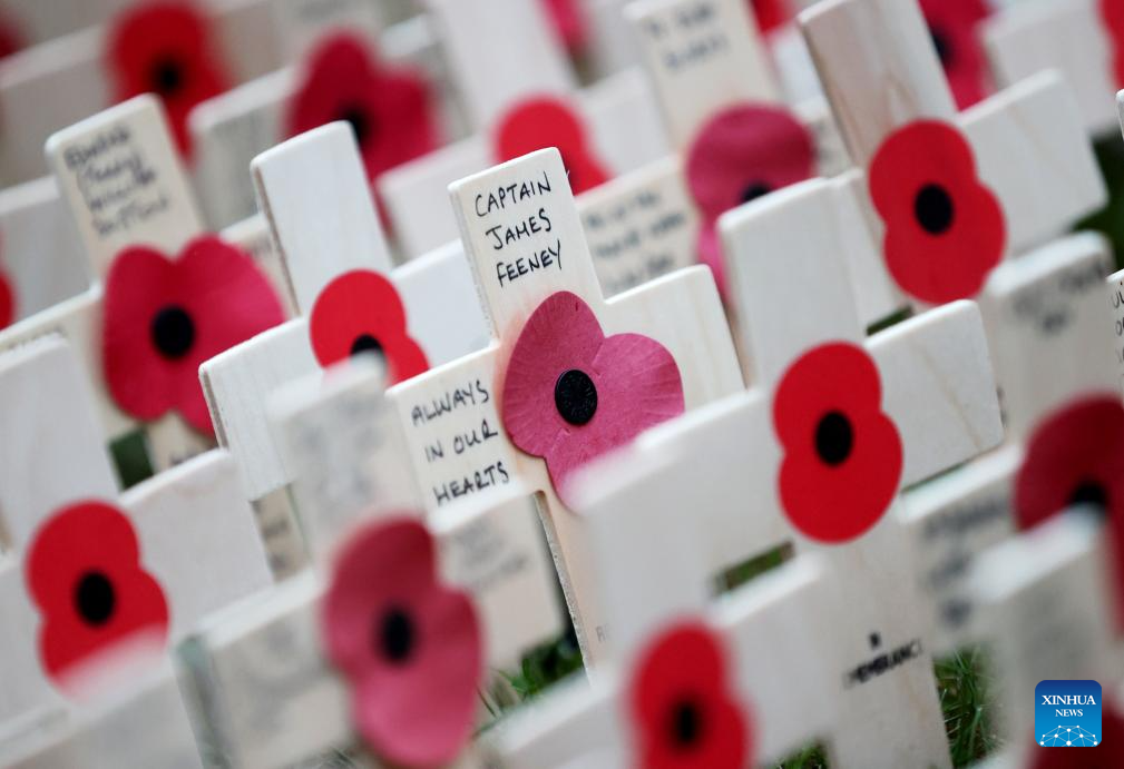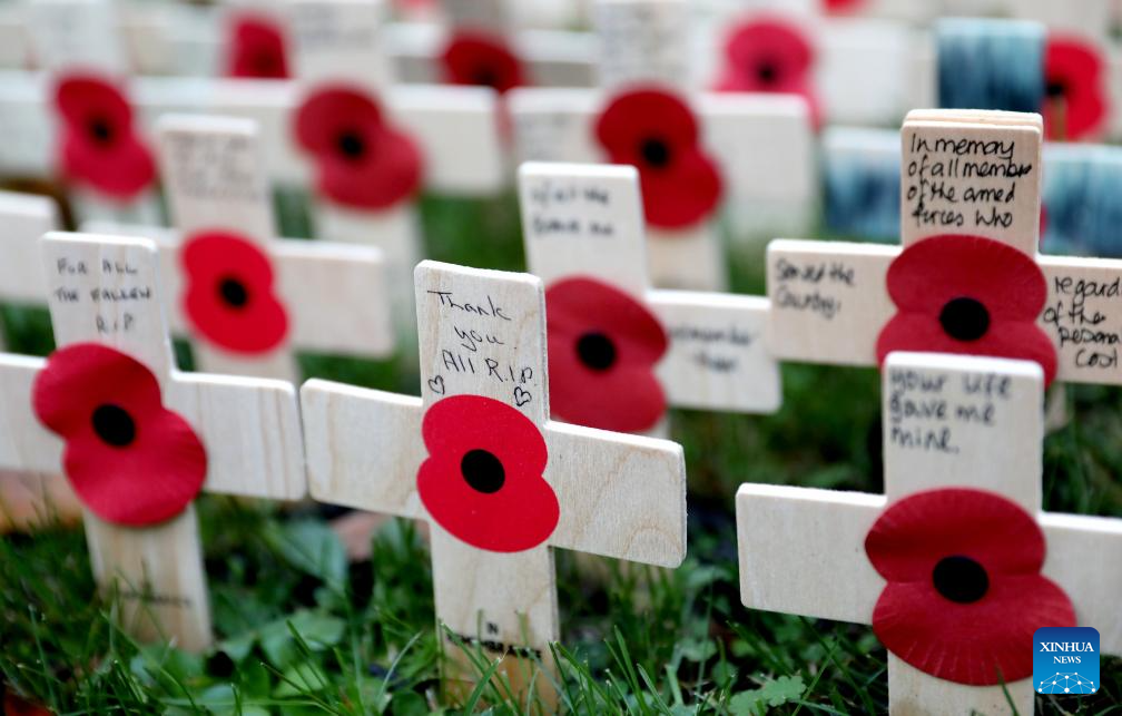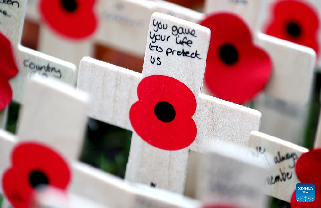 Poppy petals and crosses are seen at the Field of Remembrance at Westminster Abbey on the occasion of Remembrance Sunday in London, Britain, on Nov. 12, 2023. Remembrance Sunday is an annual commemoration held on the closest Sunday to Armistice Day, Nov. 11, the anniversary of the end of the First World War. (Xinhua/Li Ying)