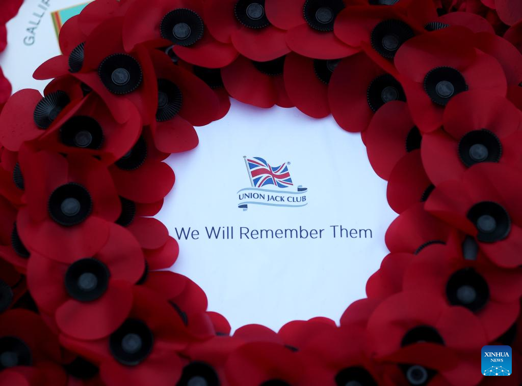 A woman is seen with poppy headwear in front of the Cenotaph on Whitehall on the occasion of Remembrance Sunday in London, Britain, on Nov. 12, 2023. Remembrance Sunday is an annual commemoration held on the closest Sunday to Armistice Day, Nov. 11, the anniversary of the end of the First World War. (Xinhua/Li Ying)