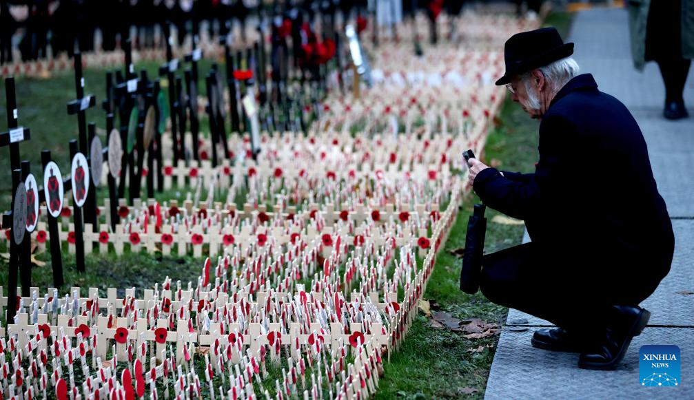 A man takes photos of poppy petals and crosses at the Field of Remembrance at Westminster Abbey on the occasion of Remembrance Sunday in London, Britain, on Nov. 12, 2023. Remembrance Sunday is an annual commemoration held on the closest Sunday to Armistice Day, Nov. 11, the anniversary of the end of the First World War. (Xinhua/Li Ying)