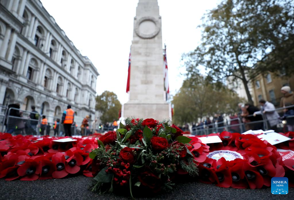 Flowers are seen at the Cenotaph on Whitehall on the occasion of Remembrance Sunday in London, Britain, on Nov. 12, 2023. Remembrance Sunday is an annual commemoration held on the closest Sunday to Armistice Day, Nov. 11, the anniversary of the end of the First World War. (Xinhua/Li Ying)