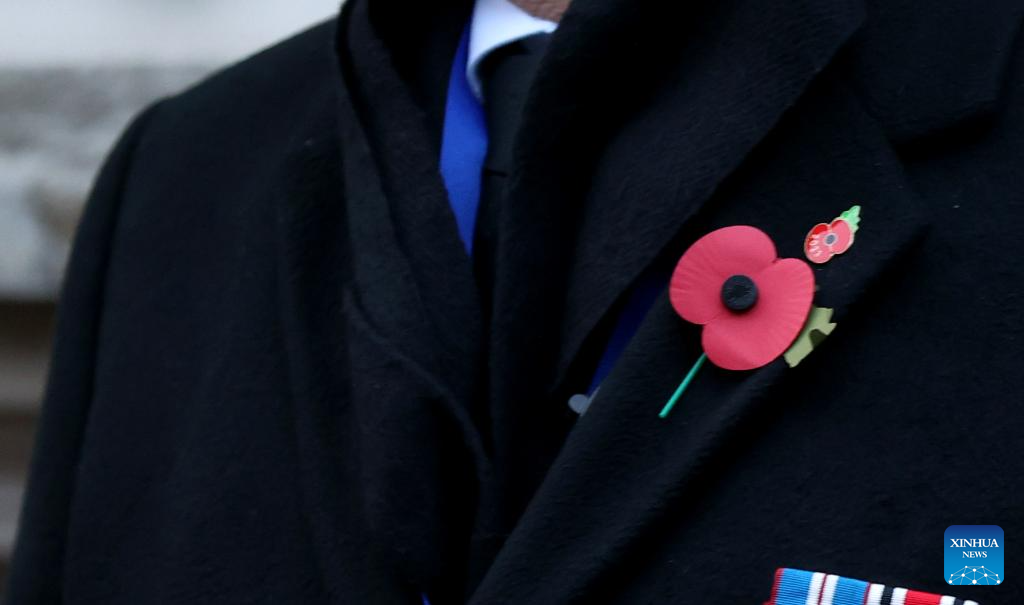 A poppy decoration on a man's suit is seen in front of the Cenotaph on Whitehall on the occasion of Remembrance Sunday in London, Britain, on Nov. 12, 2023. Remembrance Sunday is an annual commemoration held on the closest Sunday to Armistice Day, Nov. 11, the anniversary of the end of the First World War. (Xinhua/Li Ying)